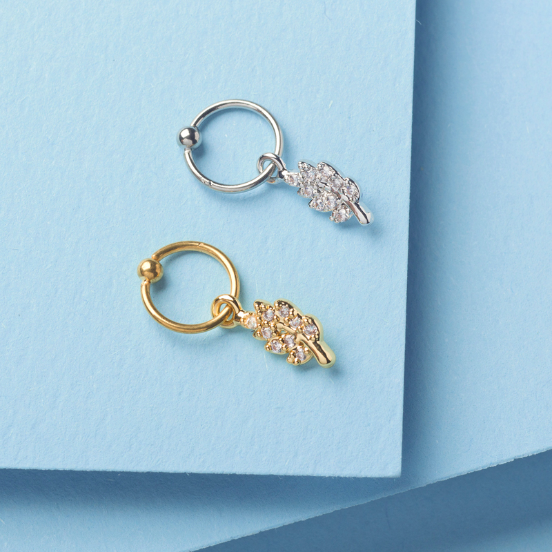Arracada 6 mm de diámetro con dije de hoja intercambiable con circonias. Presión.