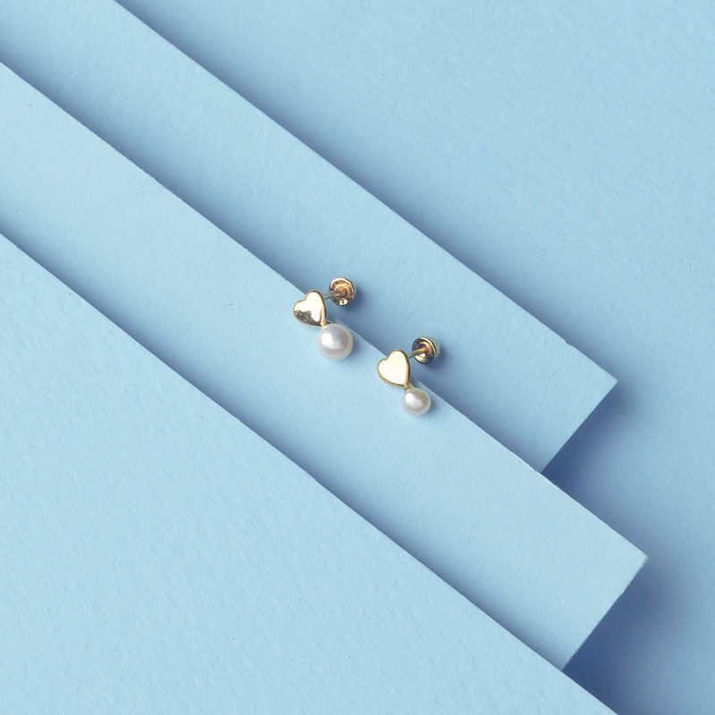 Broquel de oro 14kc tú y yo corazón y perla. Bolita atrás.