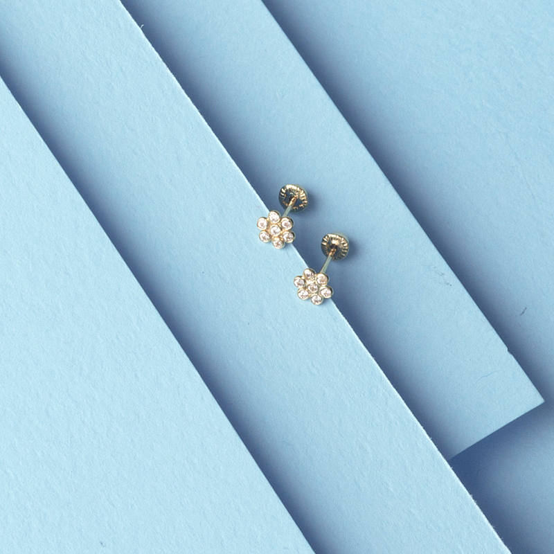 Broquel oro 14kc flor de circonias mini. Bolita atrás.