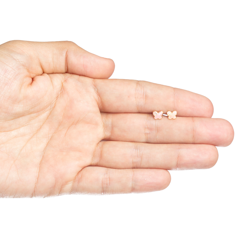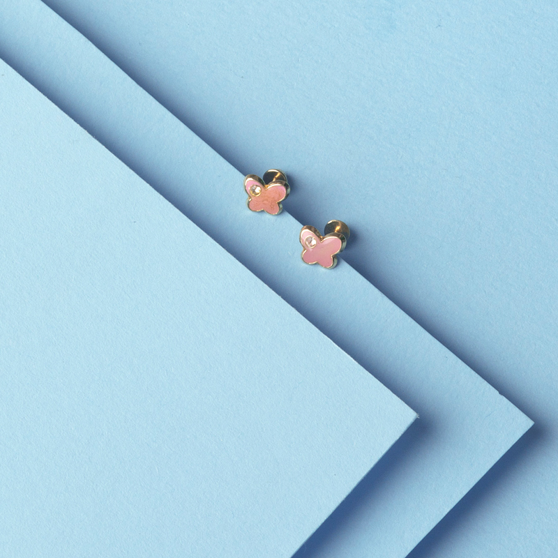 Broquel oro 14kc mariposa esmaltada rosa con circonia. Bolita atrás.